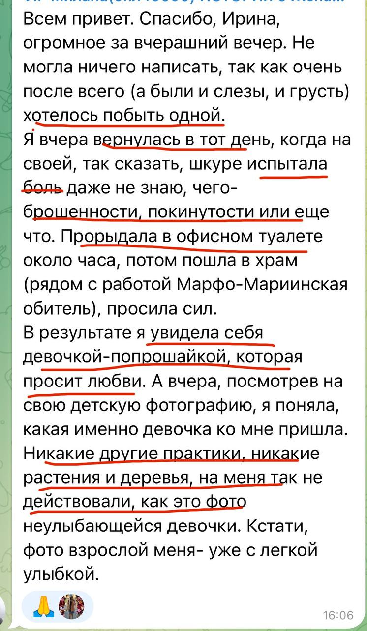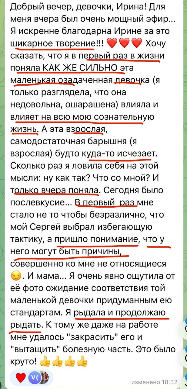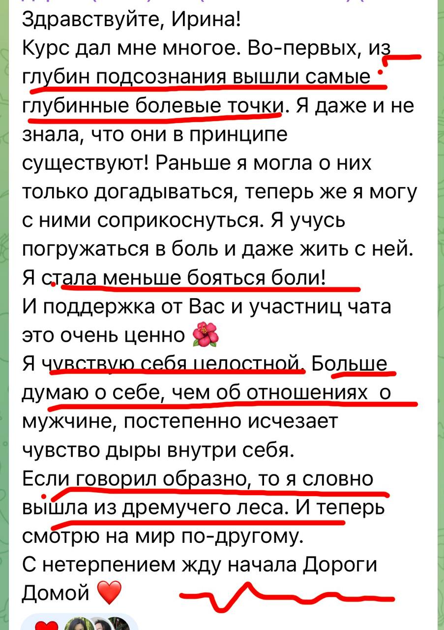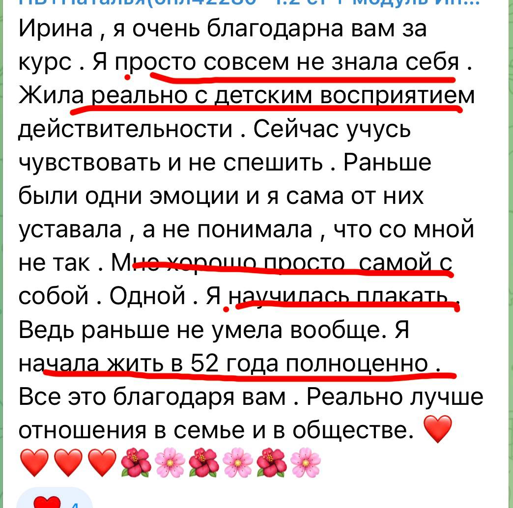 В контролируемой терапевтической обстановке вы позволите себе испытывать и выражать ту боль, которую, возможно, годами глушили. Это может быть боль от предательства, от несбывшихся надежд, от одиночества — любая. Ирина даст безопасные техники, как проживать боль экологично, без травм