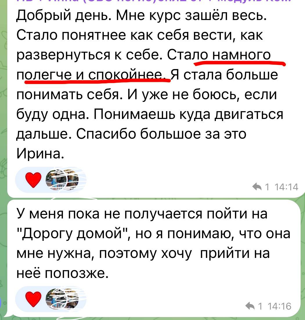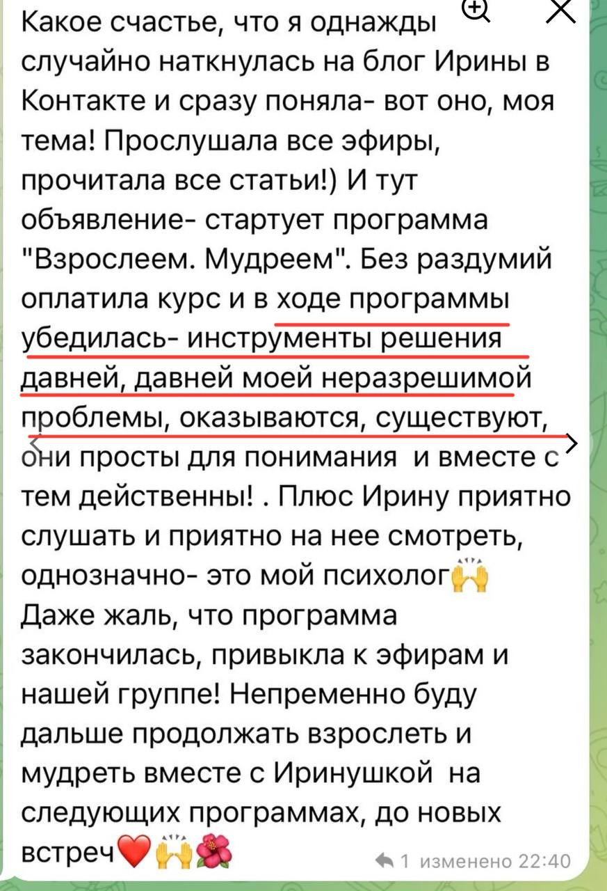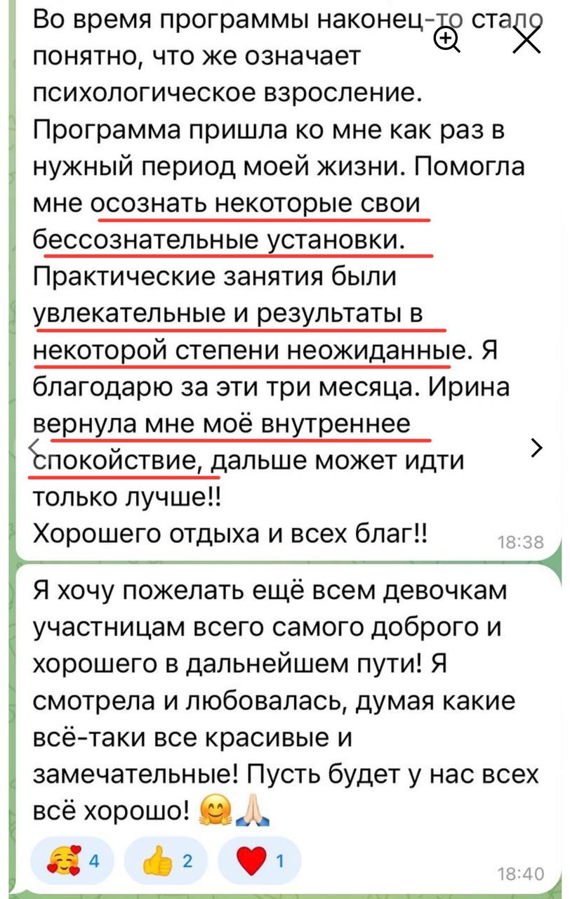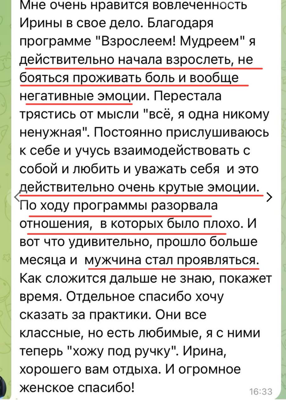 Финальное занятие — интеграция. Вы увидите, как далеко вы продвинулись: сравните свое состояние «до» и «после». Ирина поможет вам сформировать видение будущего: каким вы теперь хотите видеть свою жизнь и отношения, исходя из вашего обновленного зрелого «Я». Будут даны рекомендации, как продолжать рост, чтобы не откатиться назад. Возможно, в этот же момент расскажем про модуль об изменах (для кого актуально) и про продолжение пути (взрослая любовь).