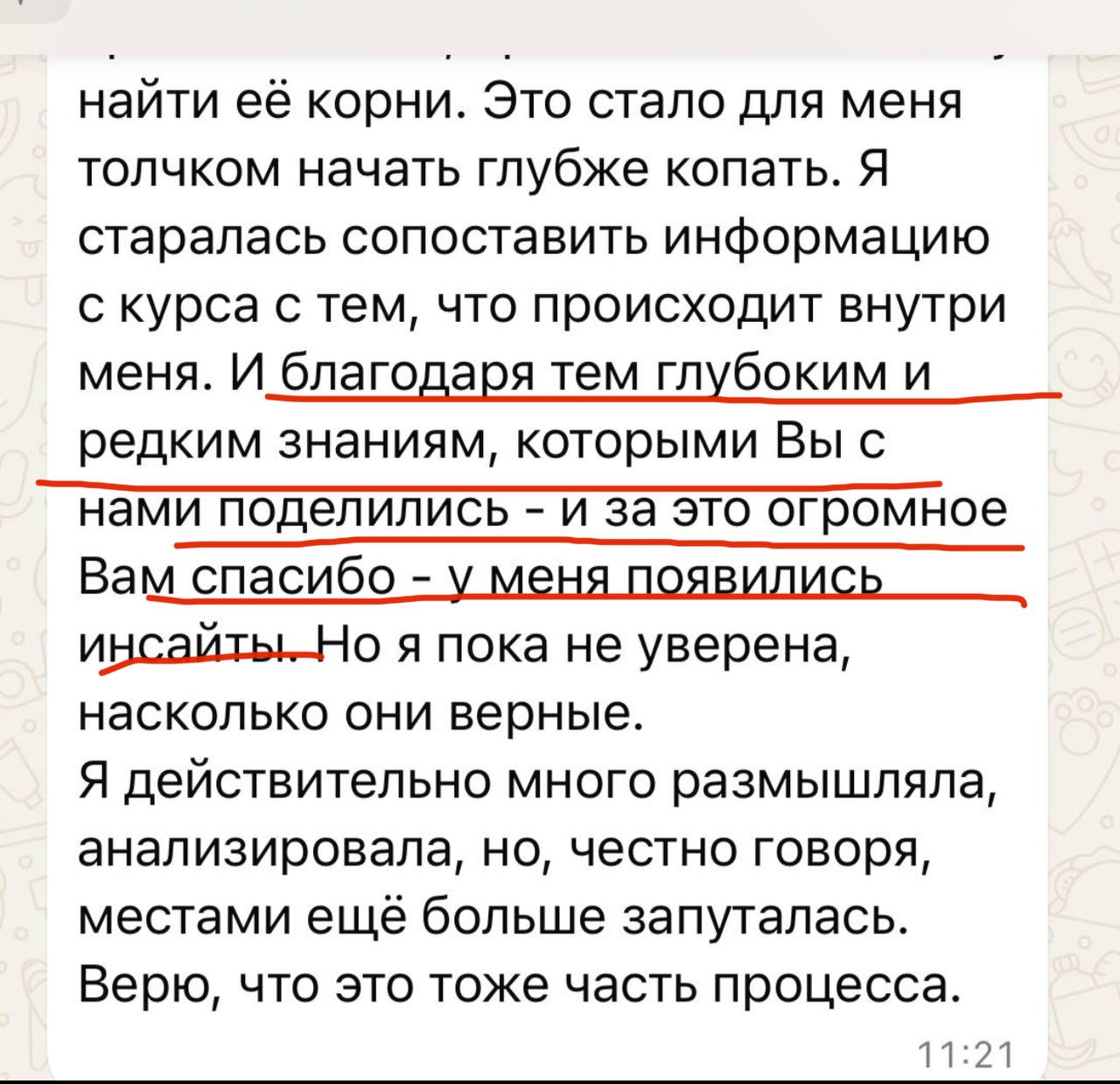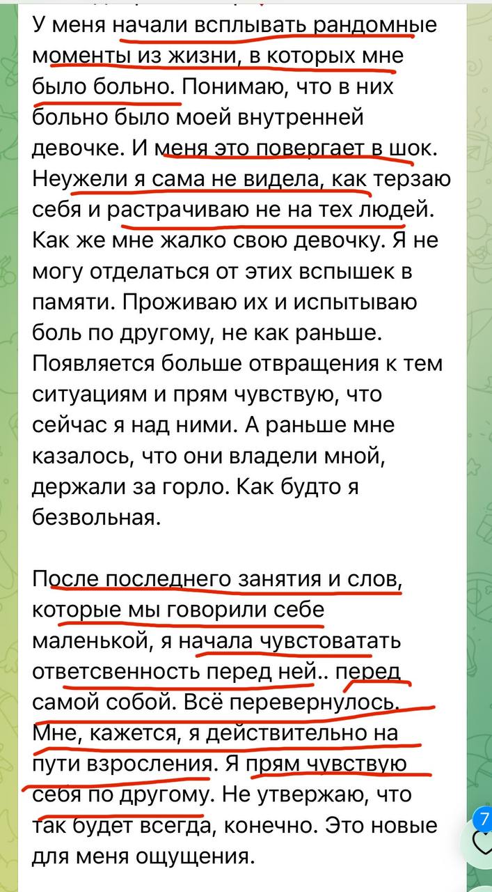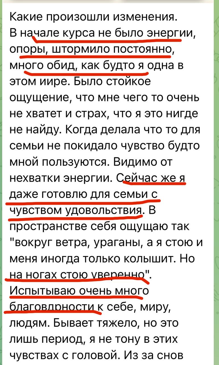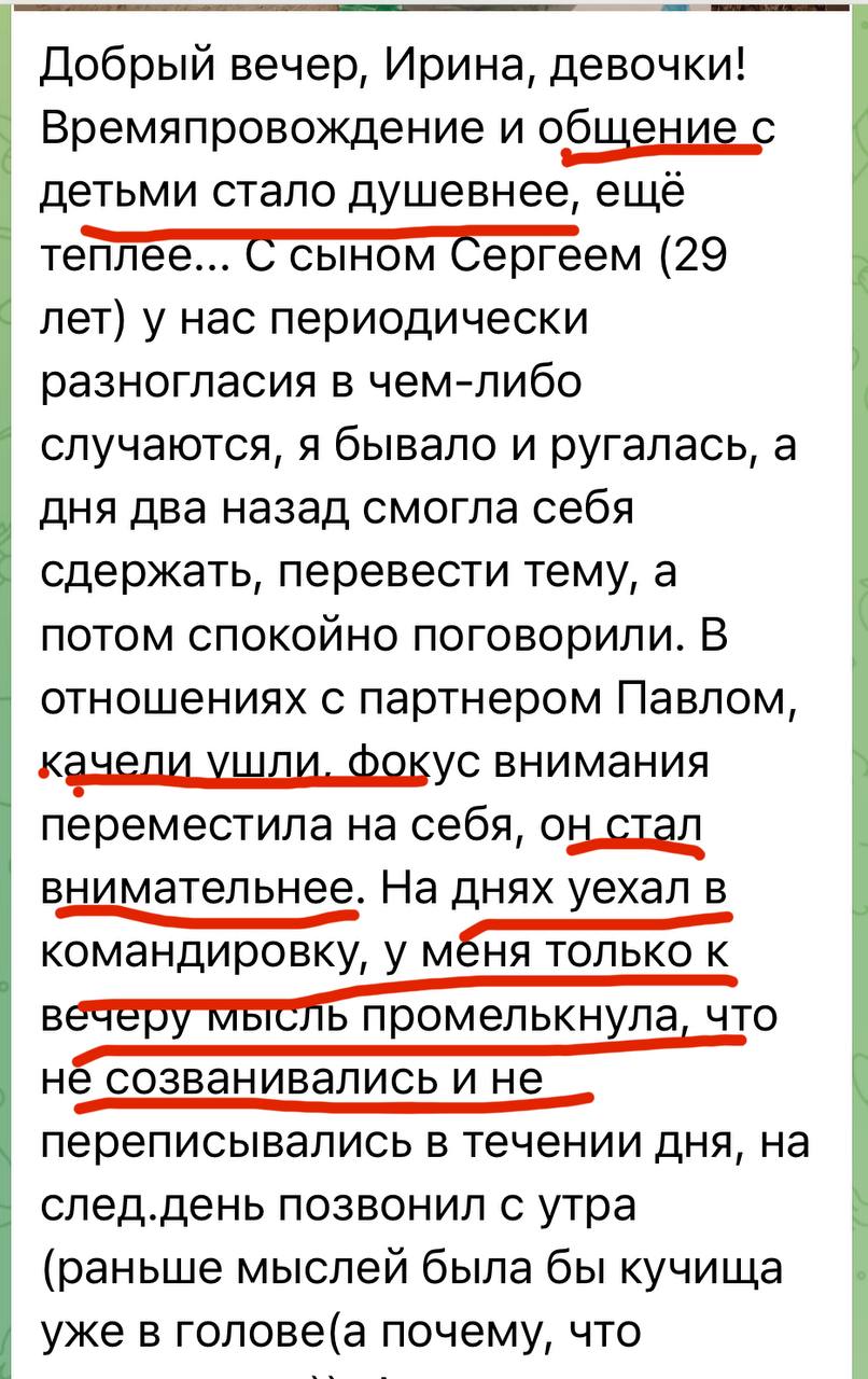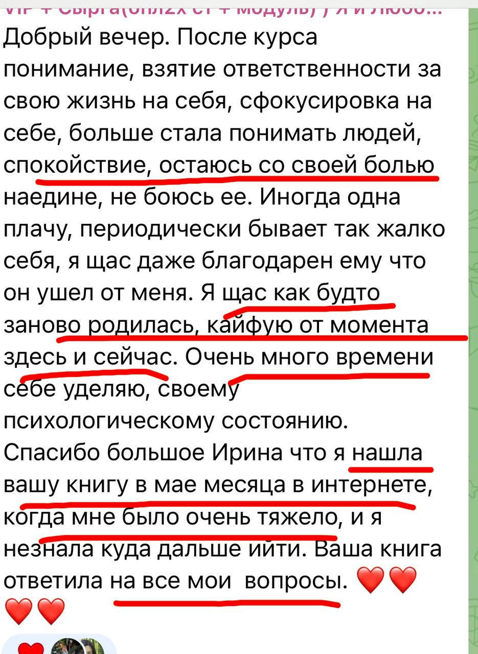 Финальное занятие — интеграция. Вы увидите, как далеко вы продвинулись: сравните свое состояние «до» и «после». Ирина поможет вам сформировать видение будущего: каким вы теперь хотите видеть свою жизнь и отношения, исходя из вашего обновленного зрелого «Я». Будут даны рекомендации, как продолжать рост, чтобы не откатиться назад. Возможно, в этот же момент расскажем про модуль об изменах (для кого актуально) и про продолжение пути (взрослая любовь).