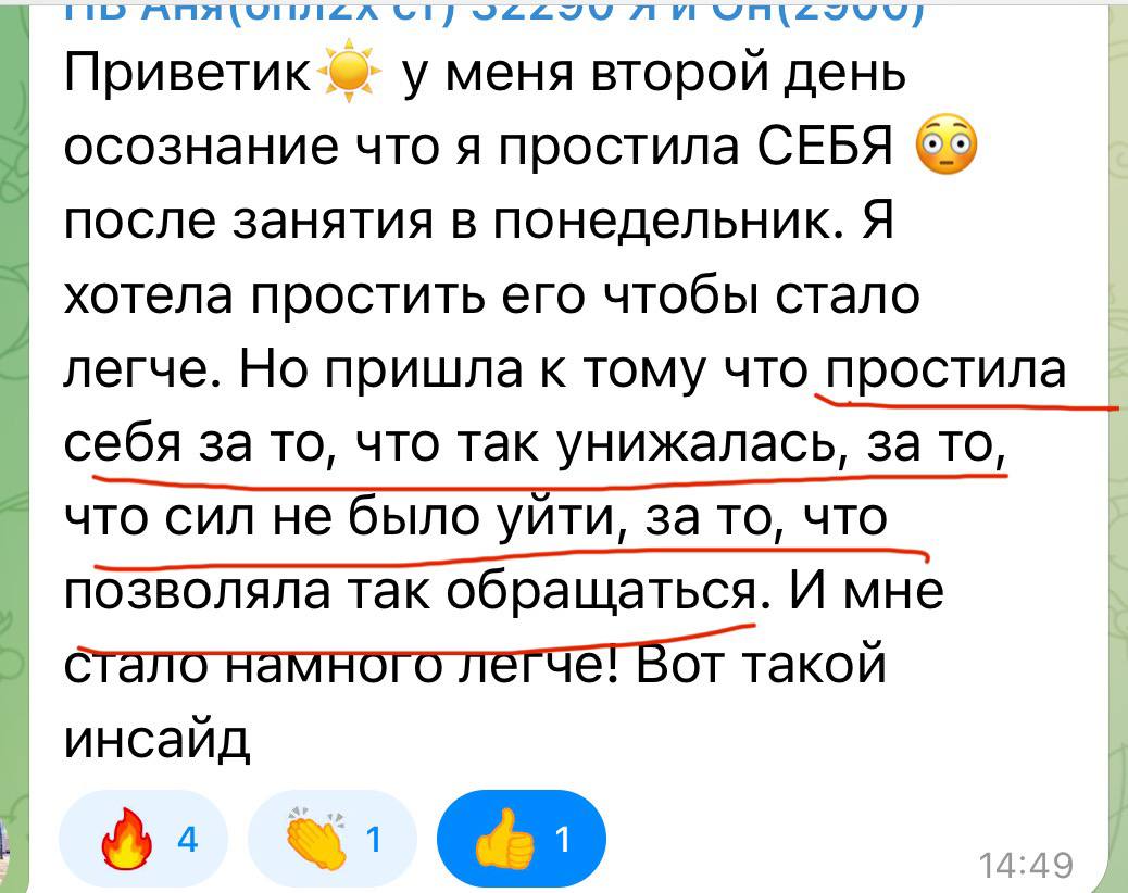 Для окончательного освобождения важно простить — себя и того, кто причинил вам боль. На одних из занятий фокус через медитации и другие техники научитесь по взрослому обходиться с обидой и агрессии. Выключим детские способы реагирования в отношениях. Больше нет войны внутри, наступает мир